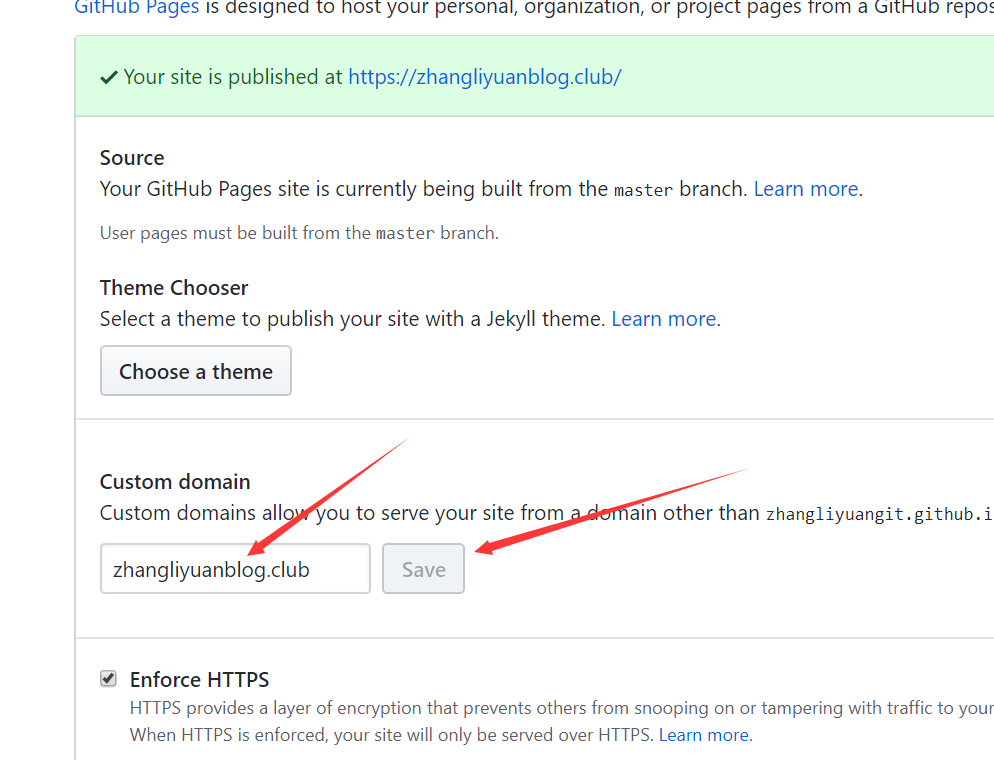 - 下滑找到Github Pages,填入自己的域名,点击save保存