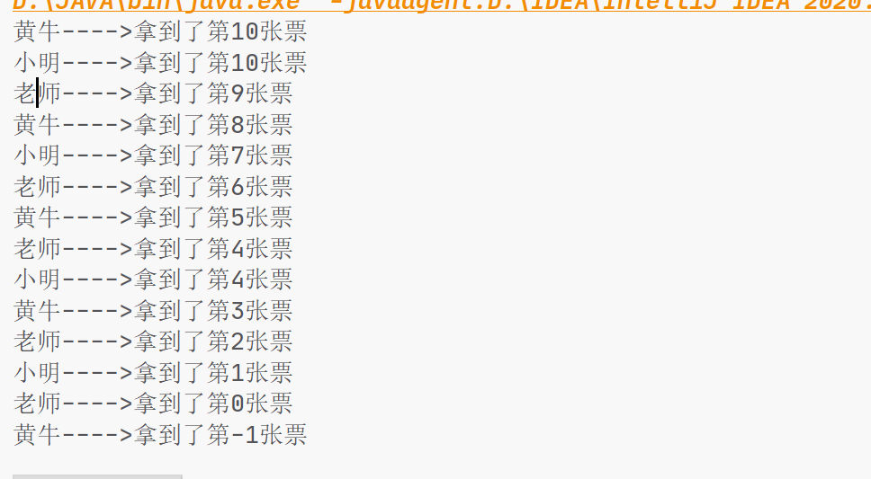 初识并发问题 1 2 3 4 5 6 7 8 9 10 11 12 13 14 15 16 17 18 19 20 21 22 23 24 25 26 27 28 29 30 31 32 33 package thread;public class TestThread4 implements Runnable { private int ticketNums = 10 ; @Override public void run () { while (true ){ if (ticketNums<=0 ){ break ; } try { Thread.sleep(200 ); } catch (InterruptedException e) { e.printStackTrace(); } System.out.println(Thread.currentThread().getName()+"---->拿到了第" +ticketNums--+"张票" ); } } public static void main (String[] args) { TestThread4 t4 = new TestThread4(); new Thread(t4,"小明" ).start(); new Thread(t4,"老师" ).start(); new Thread(t4,"黄牛" ).start(); } }