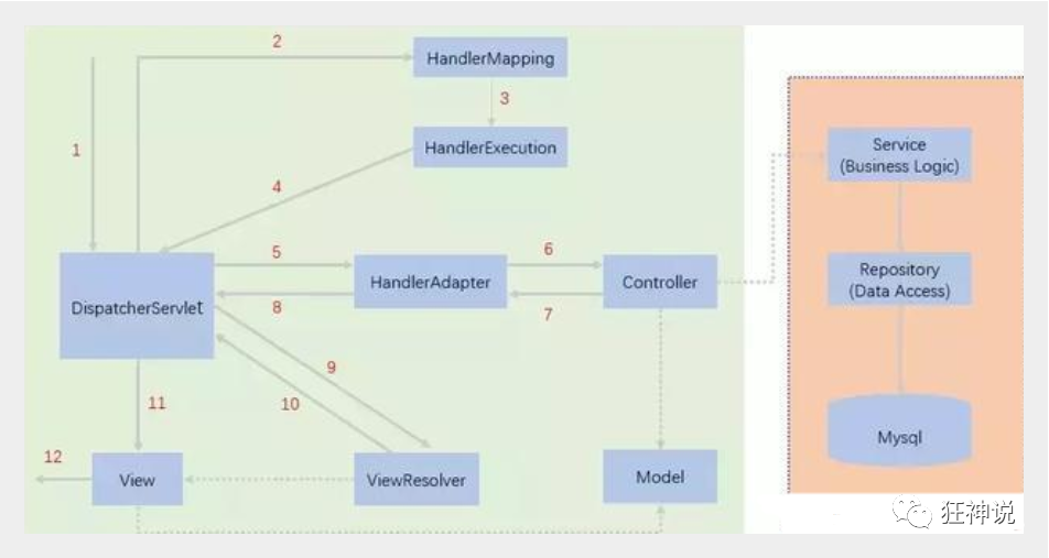 当发起请求时被前置的控制器拦截到请求,根据请求参数生成代理请求,找到请求对应的实际控制器,控制器处理请求,创建数据模型,访问数据库,将模型响应给中心控制器,控制器使用模型与视图渲染视图结果,将结果返回给中心控制器,再将结果返回给请求者。