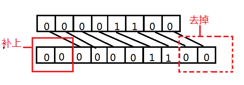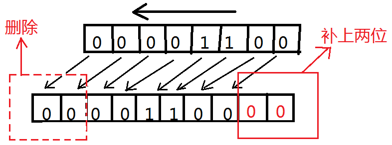 通过这个图我们可以看出来,所有的位全都向左移动两位,然后把右边空的两个位用0补上,最左边多出的两个位去掉,最后得到的结果就是00110000 结果就是48