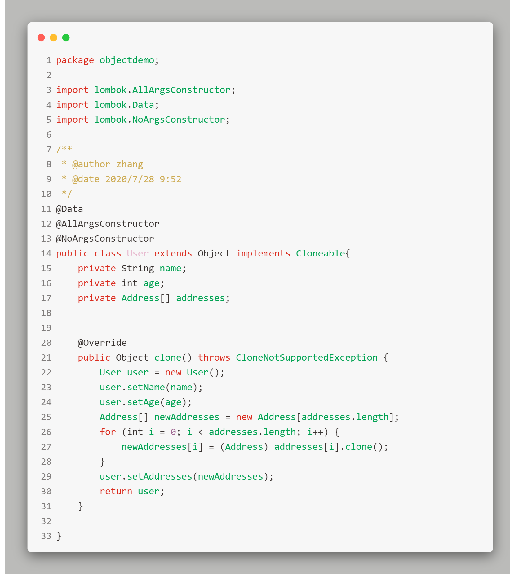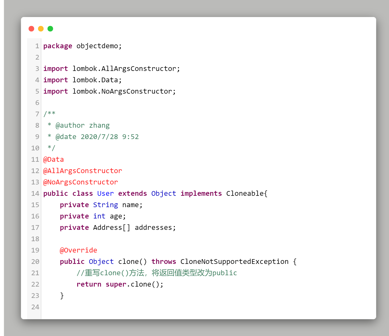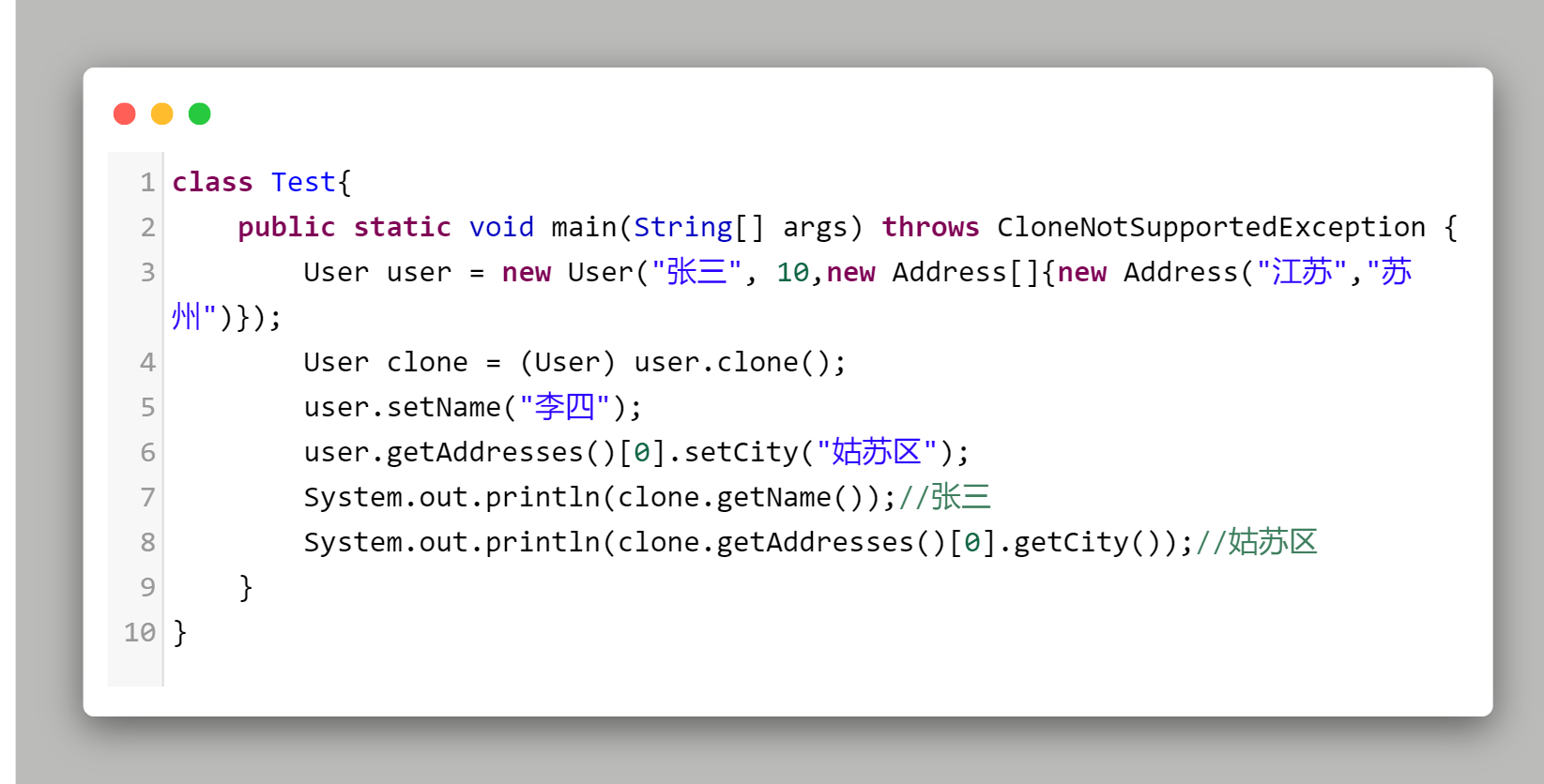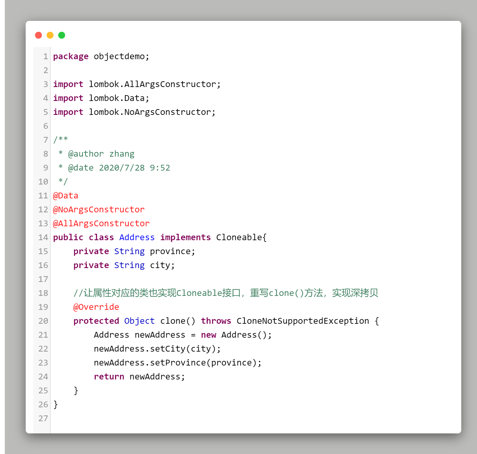 如果想实现深拷贝,我们可以让属性对应的实体类同样实现Cloneable接口,重写clone()方法。