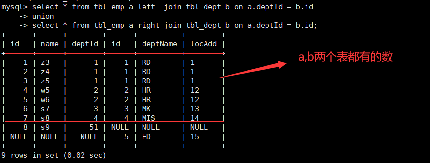 full outer join,这里我们可以使用UNION,UNION用于合并两个或多个SELECT语句的结果集。UNION 内部的 SELECT 语句必须拥有相同数量的列。列也必须拥有相似的数据类型。同时,每条 SELECT 语句中的列的顺序必须相同。