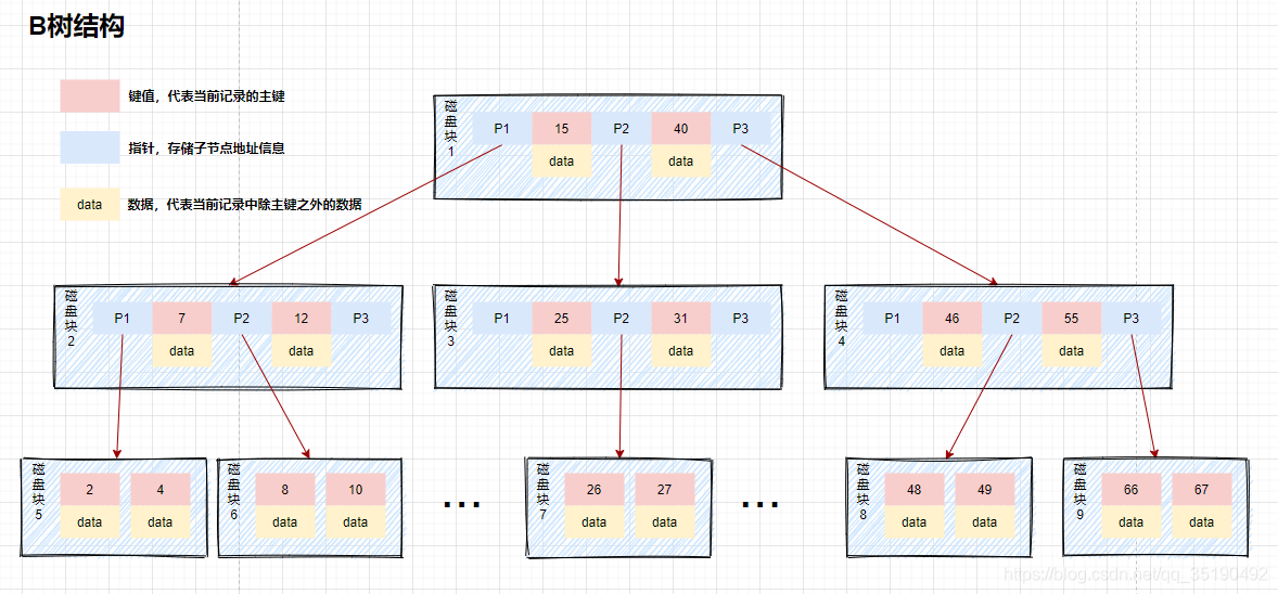 - B树:非叶子节点和叶子节点都会存储数据。