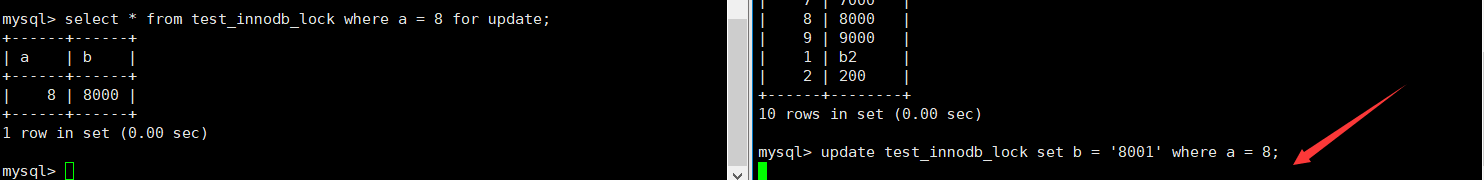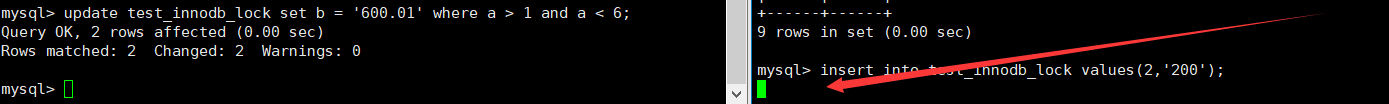 左侧执行sqlupdate test_innodb_lock set b = '600.01' where a > 1 and a < 6;不提交事务
