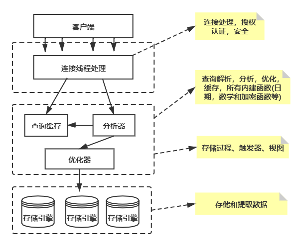 - 第一层:所包含的服务并不是MySQL所独有的技术。它们都是服务于C/S程序或者是这些程序所需要的 :连接处理,身份验证,安全性等等。